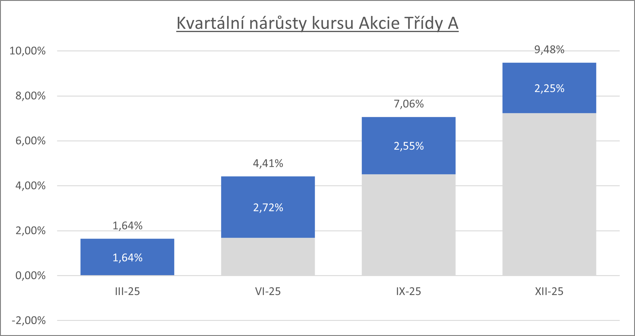 Výkonnost investičních akcií fondu činila v roce 2025 +9,48% netto.